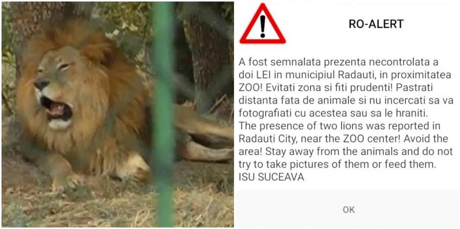 „A fost semnalată prezența necontrolată a doi lei în municipiul Rădăuți, în proximitatea Zoo. Evitați zona și fiți prudenți. Păstrați distanța față de animale și nu încercați să vă fotografiați cu acestea sau să le hrăniți”, este indicația dată de autorități prin mesajul de alertă.