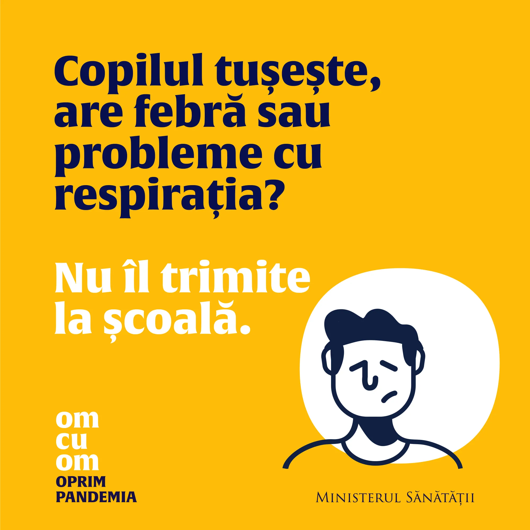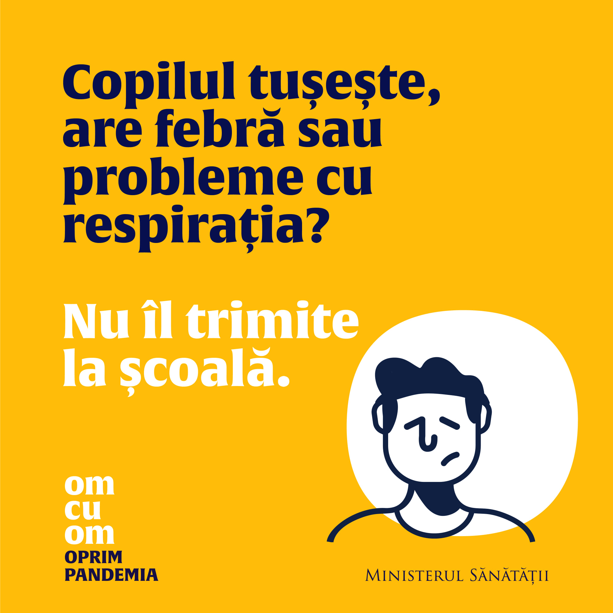 „Înainte să duci copilul la școală, fii atent la cum se simte. Cele mai frecvente simptome pentru COVID-19 sunt febra, tusea seacă, pierderea gustului și mirosului, durerile musculare, nasul înfundat, durerile de cap sau de gât și diareea. Dacă observi chiar și o parte din acest simptome la copilul tău, îți recomandăm să îl ții acasă și să iei legătura cu medicul de familie cât mai repede”, a transmis Ministerul Sănătății.