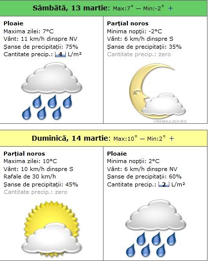 Din noaptea de vineri spre sâmbătă (12-13 martie) și pe parcursul zile de sâmbătă vor fi precipitații în cea mai mare parte a țării, mai ales lapoviță și ninsoare la munte și predominant ploi în zonele joase. Pe alocuri se va depune polei.