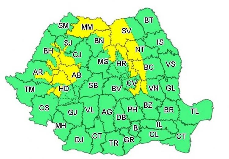 Județele care vor intra sub Cod galben sunt: Alba, Bistrița-Năsăud, Harghita, Sălaj, Arad, Cluj, Maramureș, Suceava, Bacău, Covasna, Mureș, Timiș, Bihor, Hunedoara, Neamț și Vrancea.