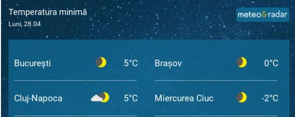 Meteorologii au emis o informare meteorologică de vreme rece și pe arii restrânse, brumă, în perioada 26 aprilie ora 23 – 29 aprilie, ora 10.