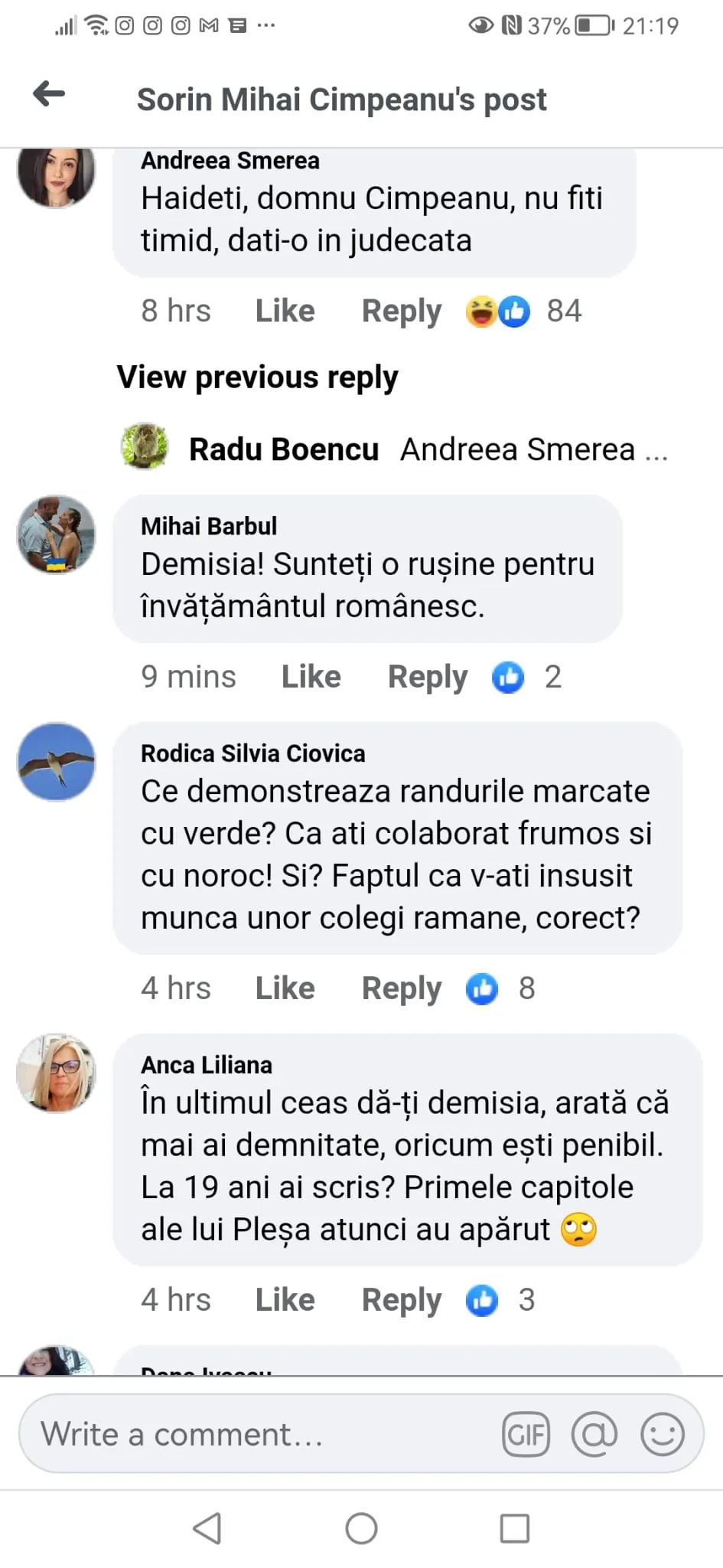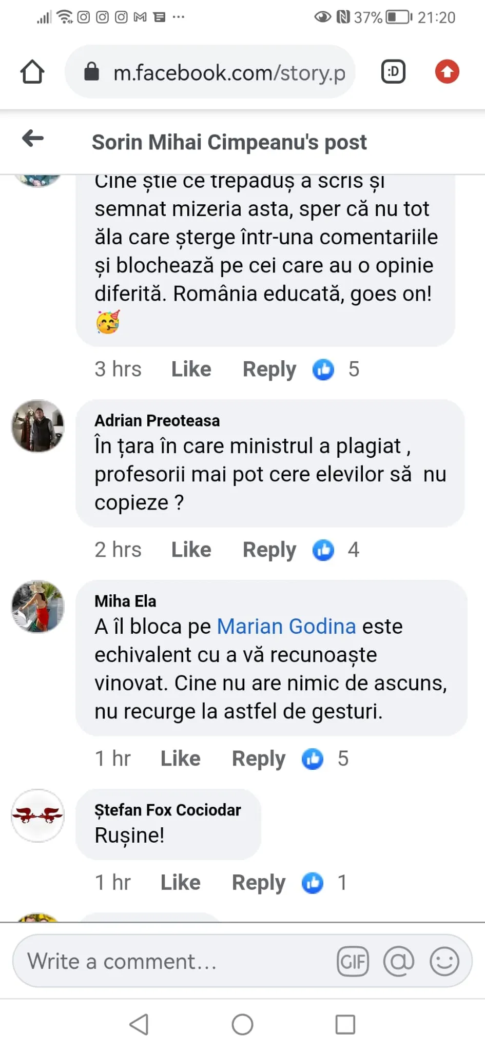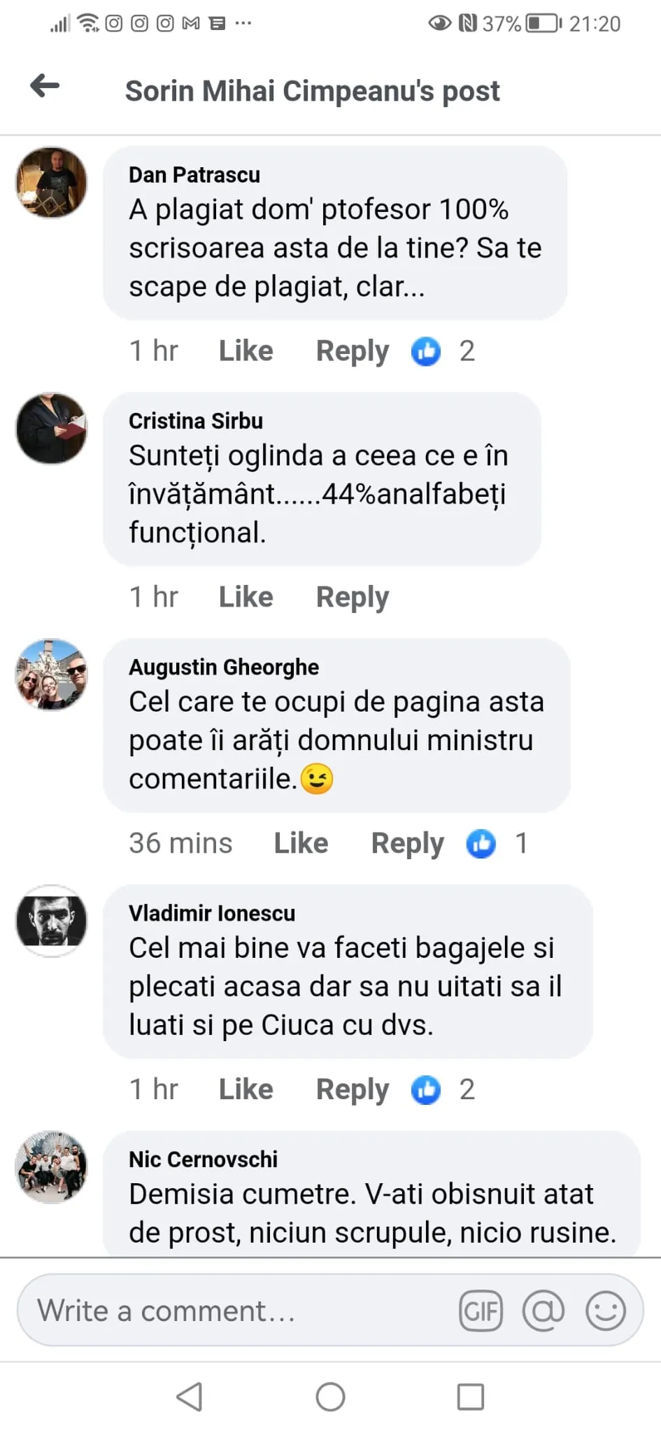 Sorin Cîmpeanu sau cineva care administrează pagina acestuia șterge în valuri comentariile negative și îi și blochează pe ”hateri”. Unul dintre cei blocați este politistul activist Marian Godină.