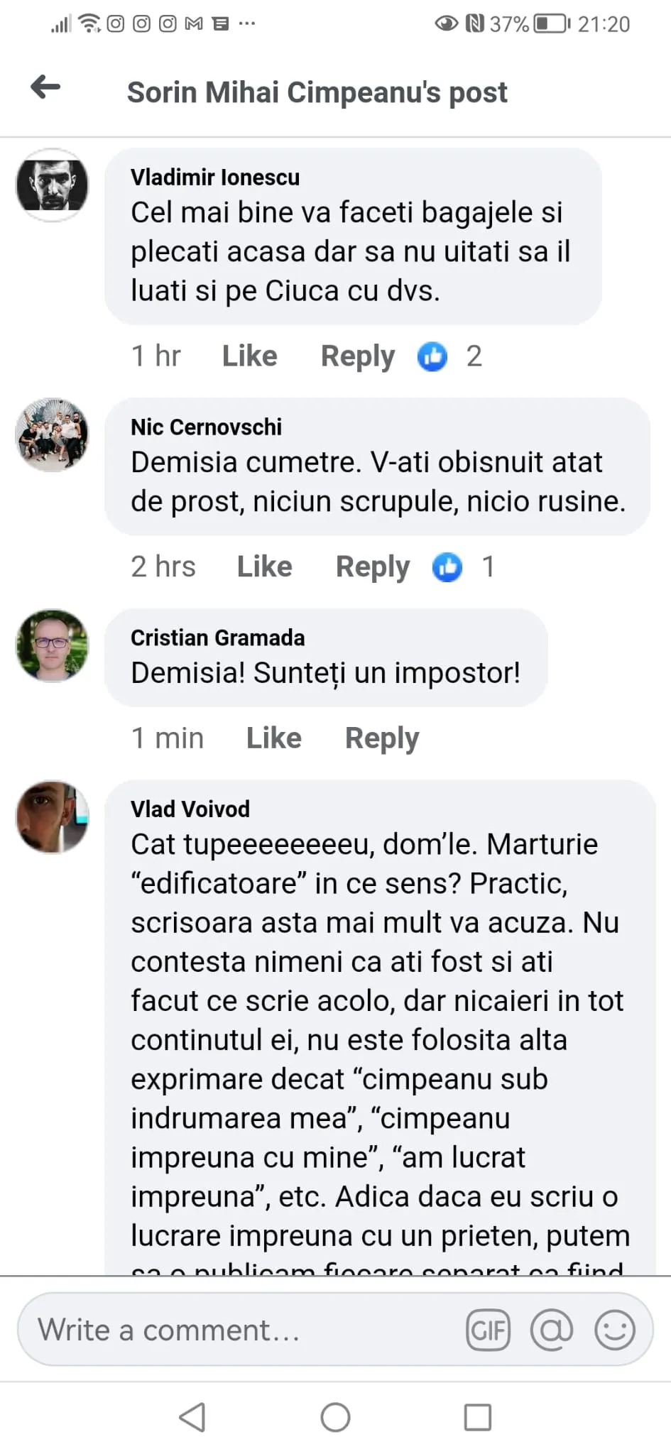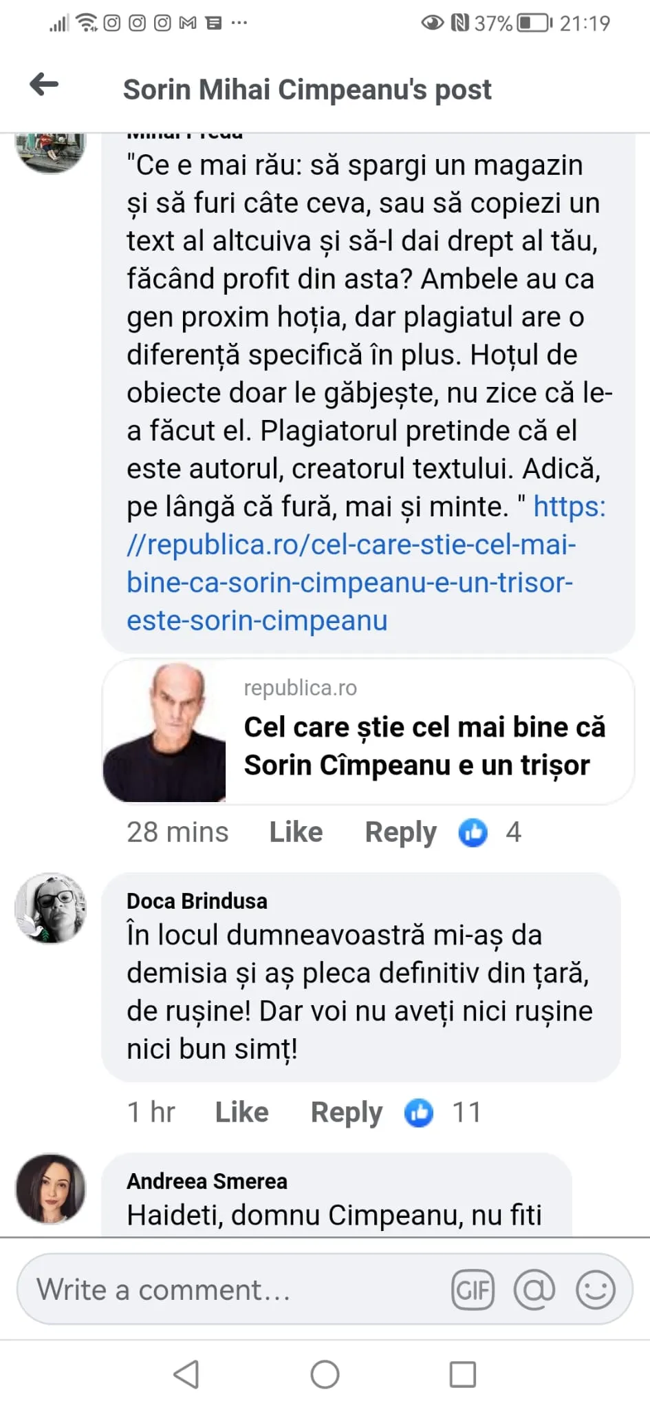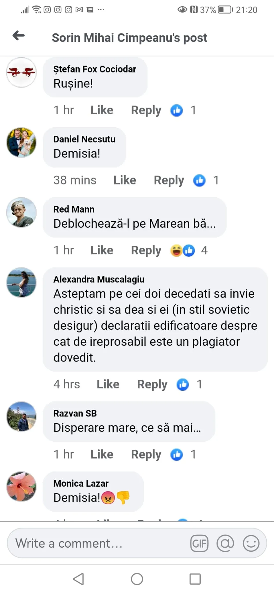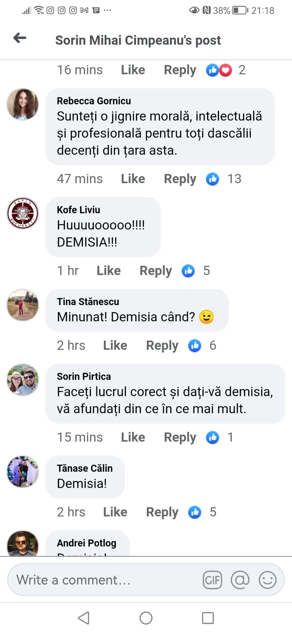 Sorin Cîmpeanu sau cineva care administrează pagina acestuia șterge în valuri comentariile negative și îi și blochează pe ”hateri”. Unul dintre cei blocați este politistul activist Marian Godină.
