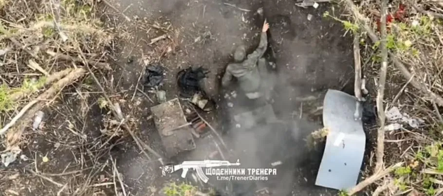O dronă a lansat o bombă peste un soldat rus care dormea liniştit în unul dintre tranşeele săpate de armata rusă. În momentul exploziei l-a trezit instantaneu pe militarul rus, care a rupt-o la fugă prin tranşee. Explozia nu l-a rănit în mod vizibil, dar cel mai probabil soldatul va avea probleme de auz în perioada următoare.