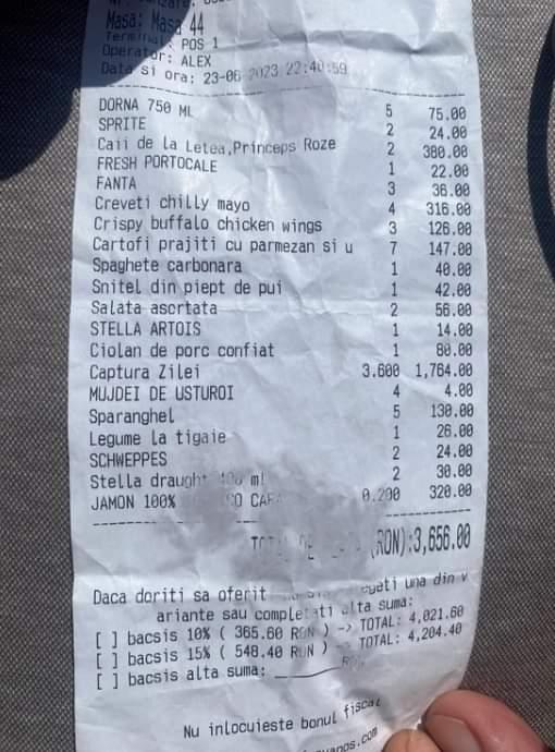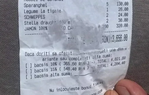 Prânzul i-a costat mai mult ca vacanța în sine, informează Adevarul.ro. Au plătit 3600 de lei, plus 400 de lei bacșiș