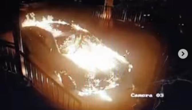 Persoana toarnă mai apoi lichidul pe mașină și îi dă foc, vehiculul fiind cuprins de flăcări.