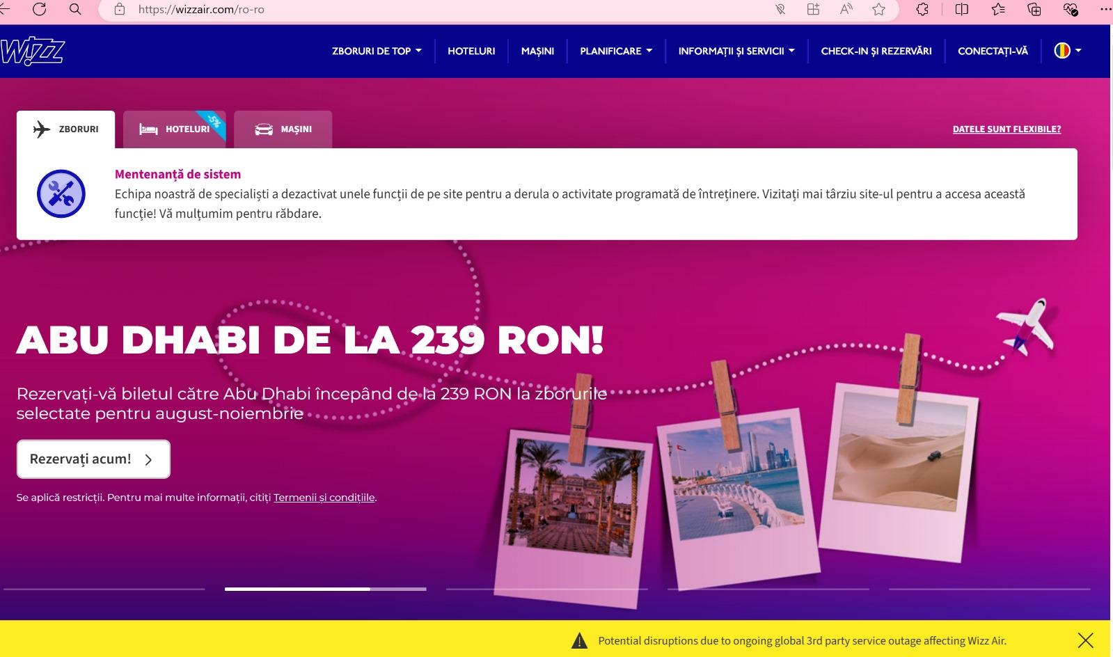 ,,În prezent, întâmpinăm întreruperi în rețea din cauza unei întreruperi de IT la nivel global, care este complet în afara controlului nostru. Rezervarea și check-in-ul sunt momentan indisponibile. Dacă urmează să călătoriți astăzi (19 iulie) și încă nu vă faceți check-in pentru zborul dvs., puteți face acest lucru la aeroport.