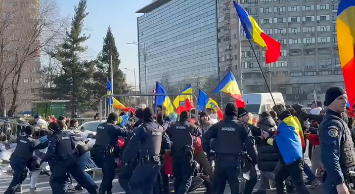 Situația a degenerat rapid, protestatarii devenind agitați, în special după ce Klaus Iohannis și-a anunțat demisia. Susținătorii lui Georgescu s-au îmbrâncit cu jandarmii, încercând să rupă cordonul acestora.