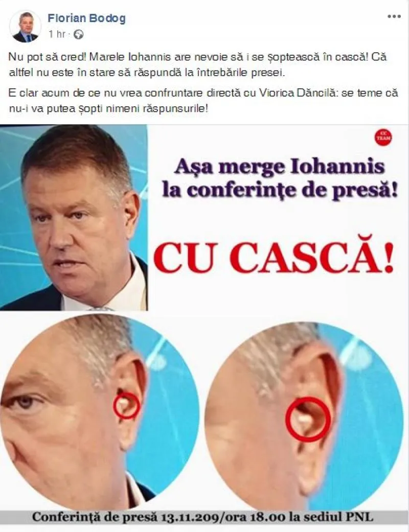 Gabriela Firea, primarul general al Capitalei, și Florian Bodog, fost ministru al Sănătății, au distribuit pe Facebook un Fake news, în care au arătat că președintele Klaus Iohannis a purtat o cască în urechea stângă la conferința de presă ținută miercuri seară. PNL a prezentat o fotografie oficială, în care se vede că totul este fals.