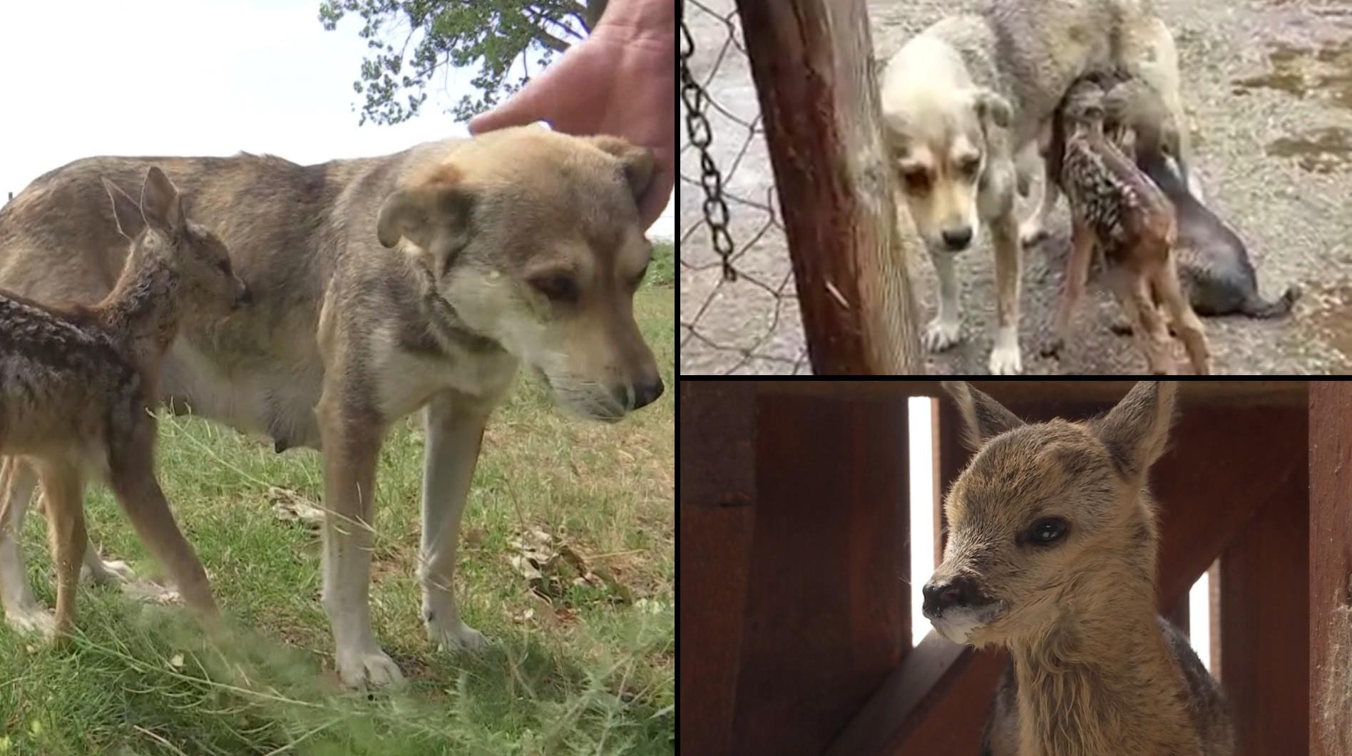 „O căţea pe care o avem în curte cu șase puişori s-a ataşat de el ca şi cum ar fi puiul ei, l-a lăsat efectiv să sugă împreună chiar cu puii ei. E ceva neobişnuit ceea ce vedem şi s-a întâmplat. Un pui de căprioară să sugă la o căţea”, declară administratorul adăpostului unde se află „mama adoptivă” a puiului de căprioară.