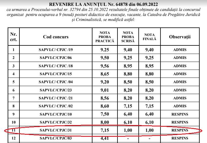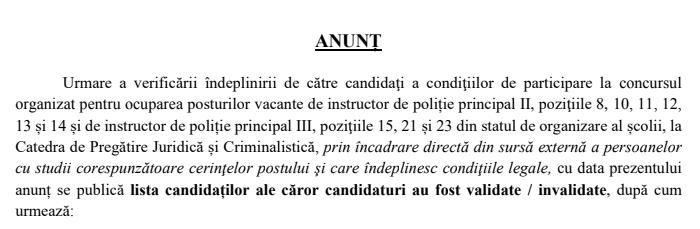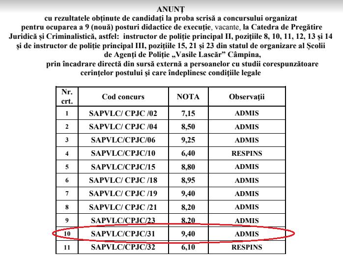 La data de 03.09.2022, au fost publicate pe pagina de internet a Școlii de Agenți de Poliție ‘Vasile Lascăr’ rezultatele obținute de candidați la proba scrisă a concursului organizat pentru ocuparea a 9 (nouă) posturi didactice de execuție, vacante, la Catedra de Pregătire Juridică și Criminalistică, candidatul având codul de concurs ‘SAPVLC/CPJC/31’, a obținut nota 9,40 fiind declarant ADMIS.