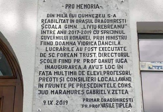 Vasile Țiplea, primarul din orașul Dragomirești, județul Maramureș, a montat pe peretele unei școli recent renovate, o placă comemorativă plinăde lingușeli și penibil.
