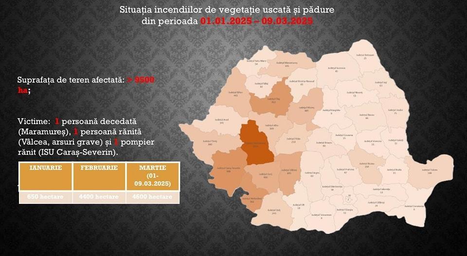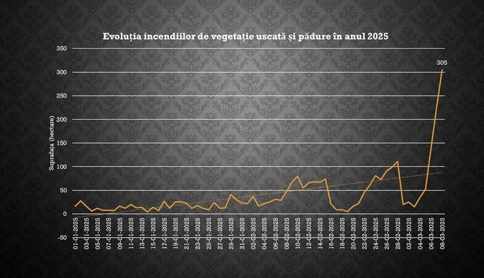 În doar câteva zile ale lunii curente au fost afectate 4.600 hectare de teren, în timp ce pe parcursul lunii februarie au fost raportate 4.400 hectare, iar în ianuarie 650 hectare.