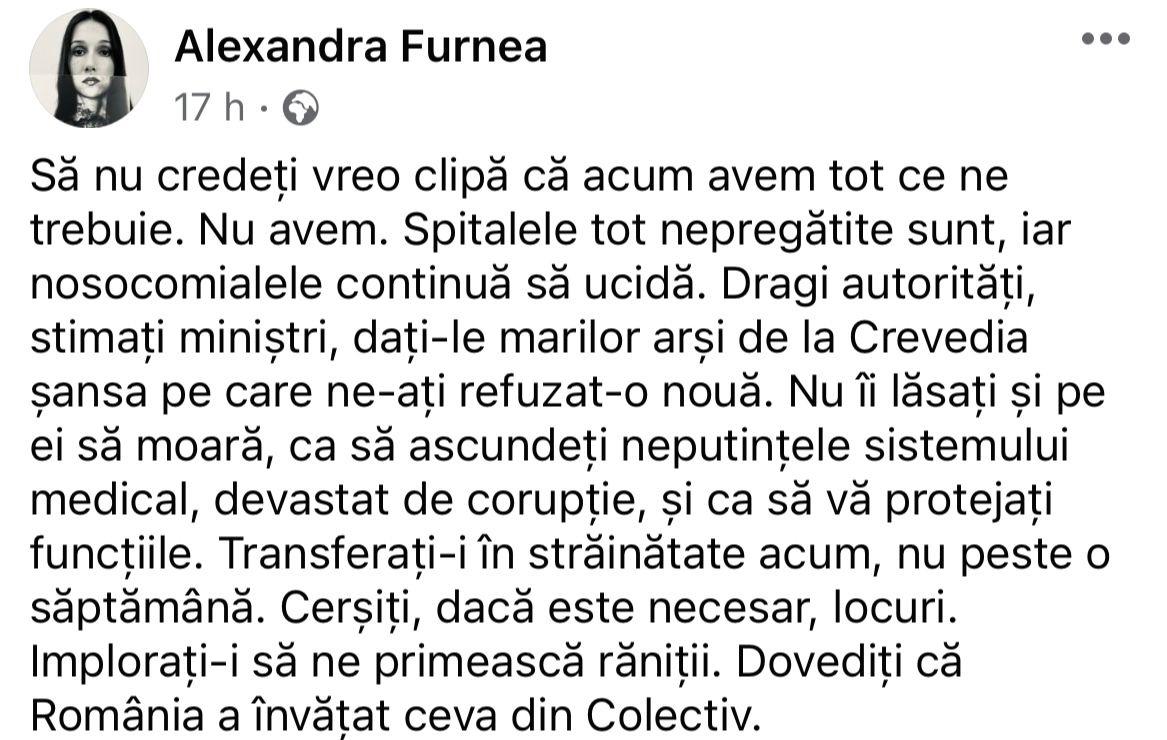 ,,Să nu credeți vreo clipă că acum avem tot ce ne trebuie. Nu avem. Spitalele tot nepregătite sunt, iar nosocomialele continuă să ucidă. Dragi autorități, stimați miniștri, dați-le marilor arși de la Crevedia șansa pe care ne-ați refuzat-o nouă. Nu îi lăsați și pe ei să moară, ca să ascundeți neputințele sistemului medical, devastat de corupție, și ca să vă protejați funcțiile. Transferați-i în străinătate acum, nu peste o săptămână. Cerșiți, dacă este necesar, locuri. Implorați-i să ne primească răniții. Dovediți că România a învățat ceva din Colectiv.”, a scris tânăra într-o postare de pe o rețea de socializare.