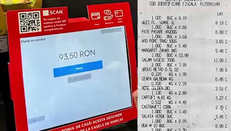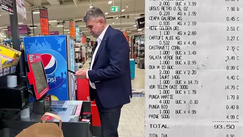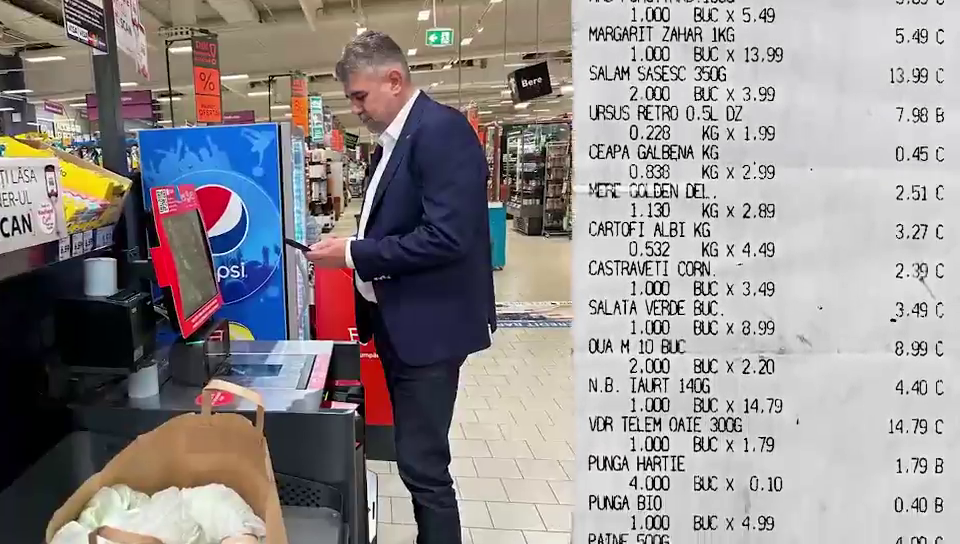 Salată, castraveți, ceapă și niște cartofi, mere și o bere Ursus, produsă la Buzău, sunt câteva dintre produsele cumpărate de Marcel Ciolacu. El prezintă și bonul fiscal: ”Total 93.50 de lei. E drept, am uitat să iau roșii, dar tot mă încadram în 100 de lei”.