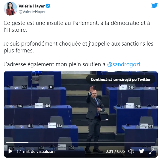 Europarlamentarul bulgar, Angel Dzhambazki, din grupul eurosceptic ECR, a ridicat brațul drept pentru câteva secunde înainte de a pleca din sală, urcând scările care duceau la ieșirea din sală.