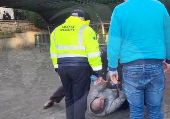 Bărbatul, îmbrăcat într-o geacă gri și pantaloni de trening albaștri, a fost înconjurat de trei persoane, în timp ce continua să se plângă din cauza celor întâmplate.