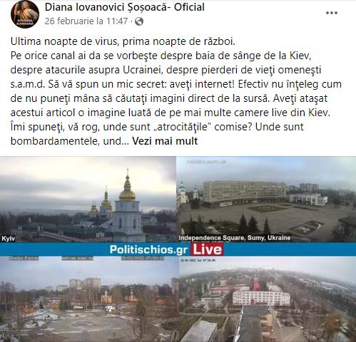 Senatoarea, Diana Șoșoacă, a ridicat semne de întrebare sâmbătă, 26 februarie, asupra atacului Rusiei împotriva Ucrainei, dar și a bombardamentelor din Kiev. Aceasta a publicat pe pagina sa de facebook un articol preluat dintr-un blog și a spus că pe camerele live din Kiev nu se vede niciun semn al atacurilor.