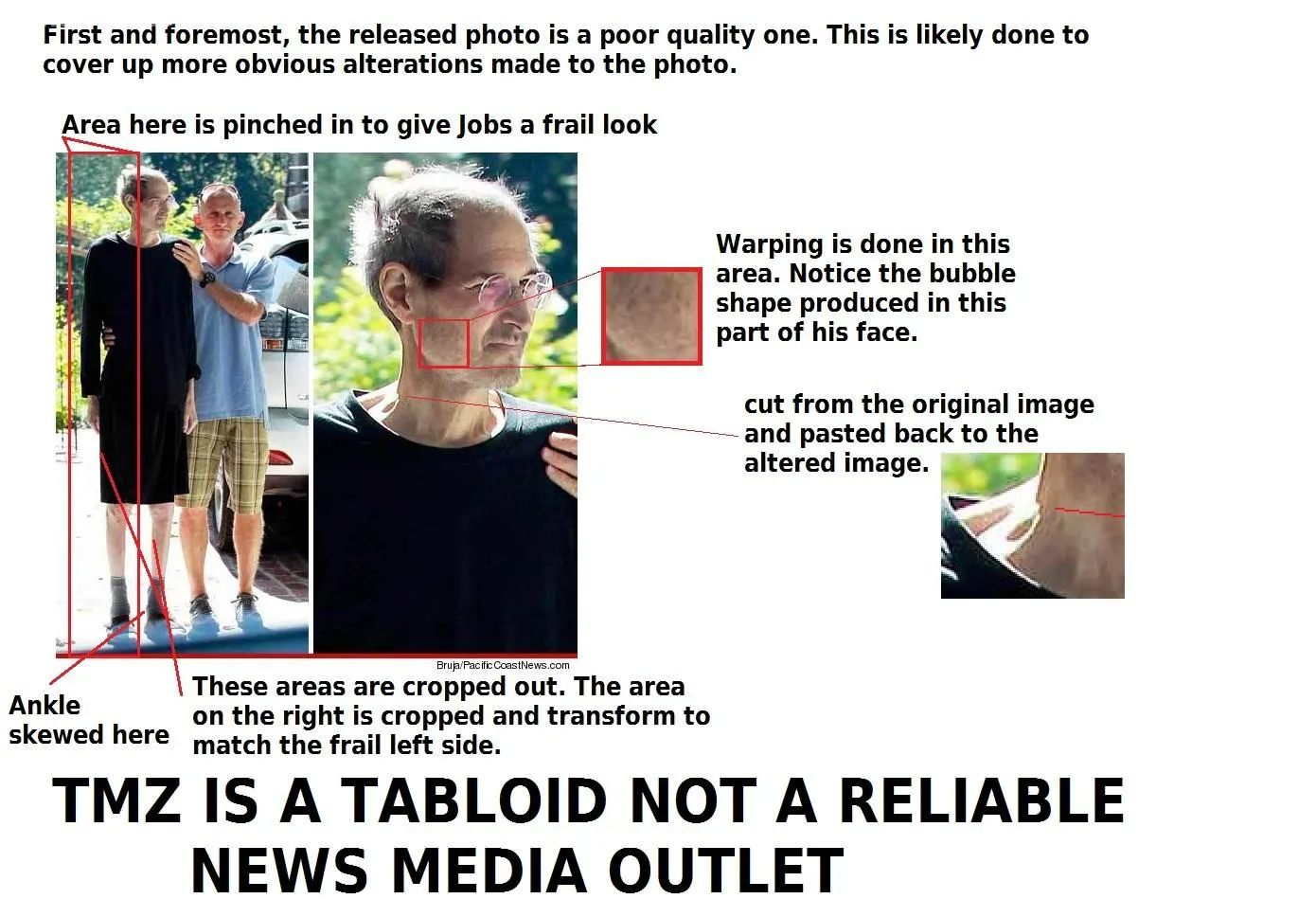 Imaginile sunt suspectate ca ar fi un fals, pentru ca au o calitate slaba pentru a acoperi faptul ca au fost trucate. De asemenea, unele zone par a fi prelucrate in photoshop pentru ca Steve Jobs sa para si mai slab.