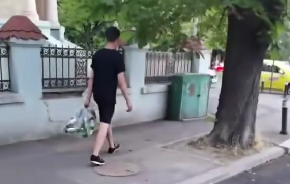 Imaginile surprinse arată un băiat care se află în posesia unui sac cu sticle reciclabile. În urma lui, un bărbat îl filmează și strigă după acesta să lase sticlelele deoarece nu sunt a lui, spunând că ar fi fost furate.