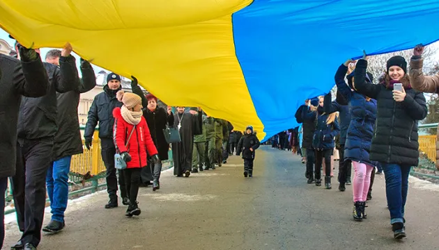Pe stadionul olimpic din Kiev a fost derulat un steag lung de 200 de metri, iar președintele Zelenski a spus că ucrainenii sunt uniți în jurul unei dorințe comune ”de a trăi în pace, fericiți, într-o familie”.
