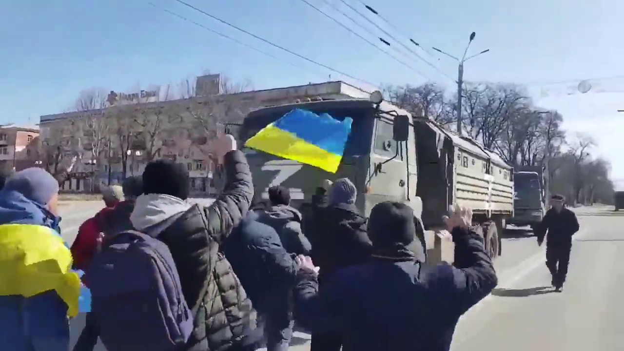 Ucrainenii din orașele ocupate se pun în fața camioanelor marcate cu litera ”Z” - VIDEO