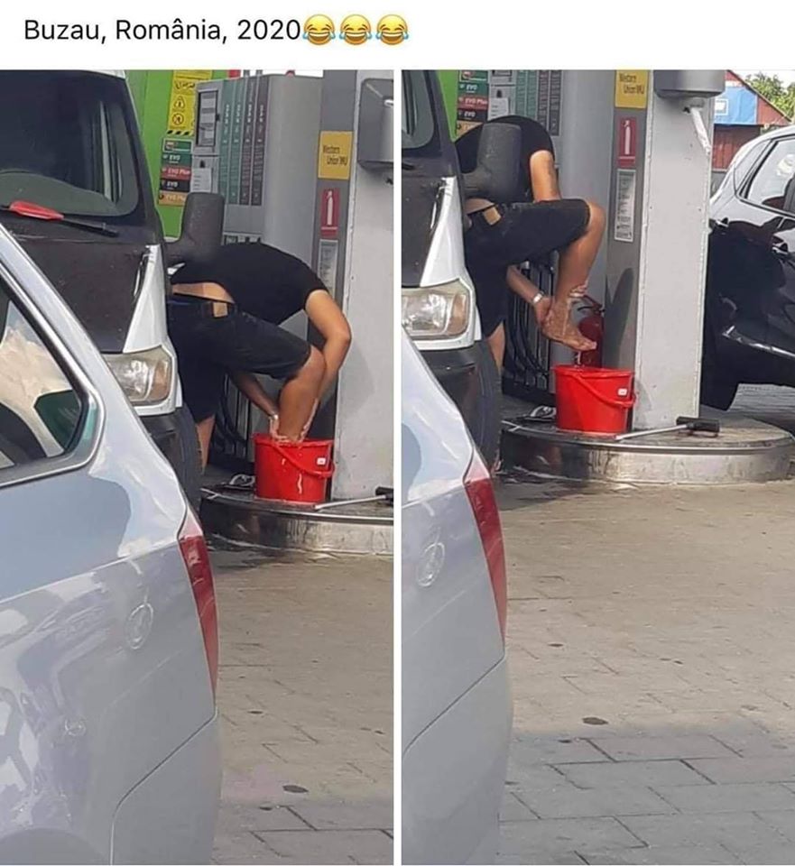 Un român a fost fotografiat în Buzău într-o benzinărie, în timp ce își spăla picioarele în găleata cu soluție pentru spălat parbrize.