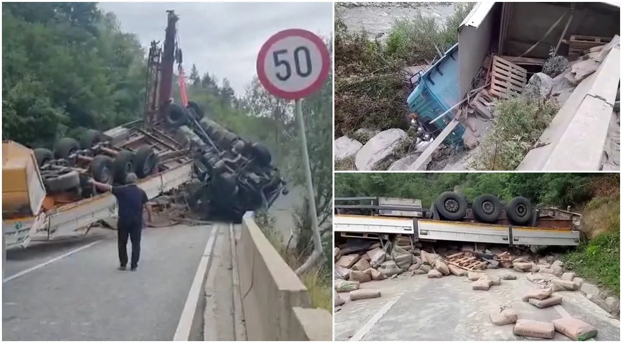 Imagini dezastruoase, după ce un TIR încărcat cu ciment s-a răsturnat și a blocat circulația pe ambele sensuri.
