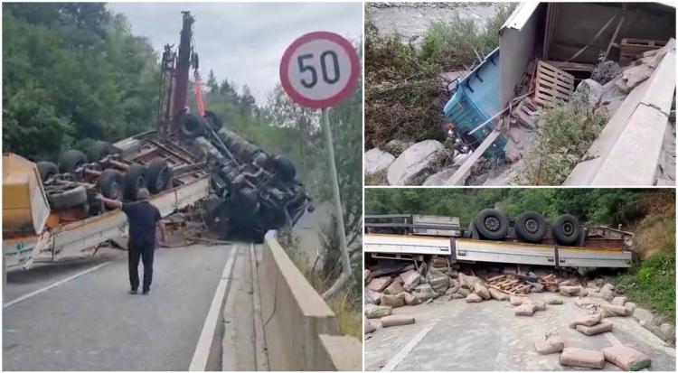 Un TIR plin cu ciment s-a făcut una cu pământul în Defileul Jiului. Camionul a blocat în totalitate circulația din zonă