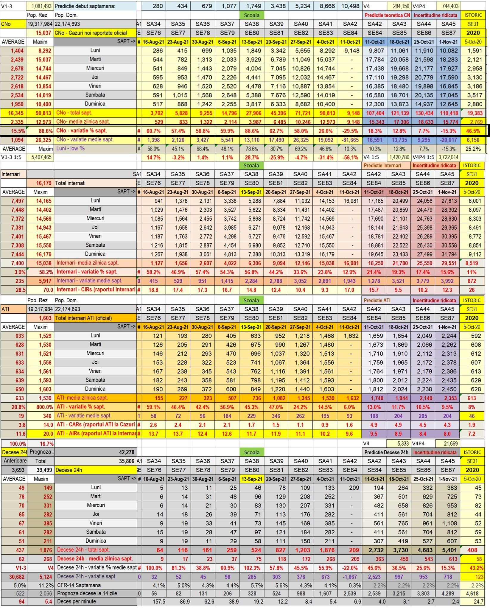 ”Săptămâna trecută am avut pentru prima dată o scădere a ratei de creștere săptămânale, sub 50%, iar debutul de luni este sub prognoză. Chiar dacă și în această săptămâna numărul de cazuri va continuă să crească și de mâine vom vedea valori de peste 16.000 cu un vârf săptămânal în jurul a 17.000 de cazuri, ne apropiem de vârful sau platoul valului 4-Delta pe care îl așteptăm la mijlocul lunii octombrie. E posibil că aceasta să fie ultima săptămâna de creștere accelerată și putem speră (cu rezerve) că încă de săptămâna viitoare vom vedea valori descendente în privința numărului de cazuri noi. Dacă e vârf sau platou e o discuție în sine și voi reveni cu o analiză a celor două scenarii posibile”, scrie pe Facebook dr. Octavian Jurma.