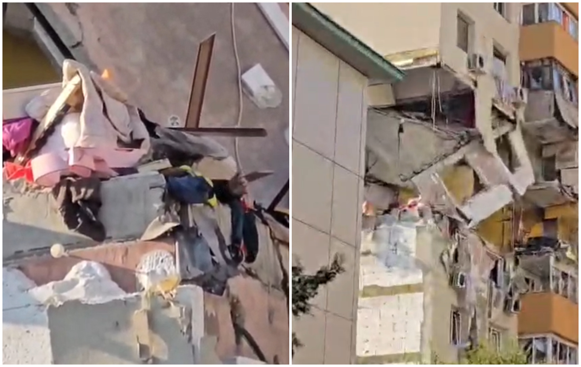 Și mai șocant, au rămas oameni prinși sub dărâmături, iar blocul stă să se prăbușească. O astfel de persoană a fost surprinsă în timp ce își mișcă mâna, ca și cum ar cere ajutor, dar nimeni nu poate ajunge acolo. Neputincioși, civilii de pe margine se uită la aceste imagini.