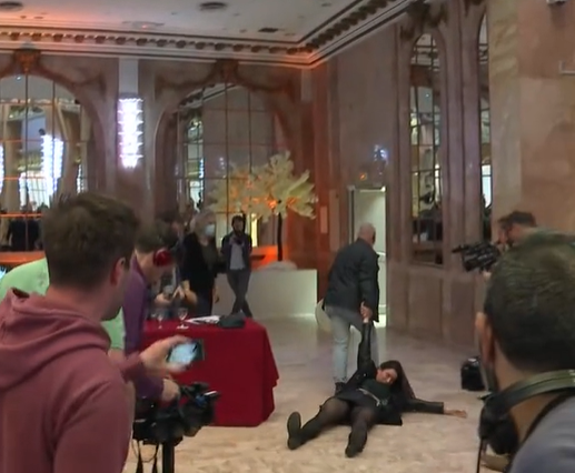 O femeie a fost pur și simplu pusă la pământ și târâtă pe podea după ce a îndrăznit să protesteze împotriva candidatei la prezidențiale Marine Le Pen, la o conferință de presă. Femeia ținea în mâini o fotografie cu Le Pen și Vladimir Putin, făcută în 2017, moment în care un agent de securitate a placat-o.