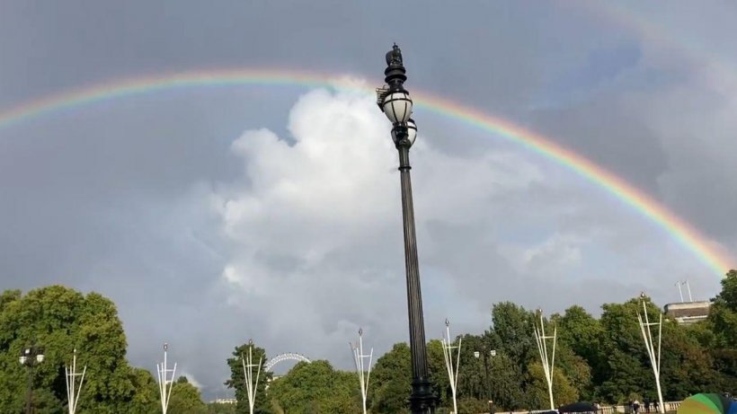 Un curcubeu dublu a apărut deasupra Palatului Buckingham din Londra în timp ce mulțimea se aduna pentru a-și lua rămas bun de la regina Elisabeta a II-a.