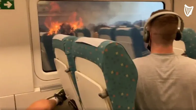 VIDEO - Imagini cu momentul în care pasagerii unui tren oprit în mijlocul câmpului realizează că sunt înconjurați de flăcări