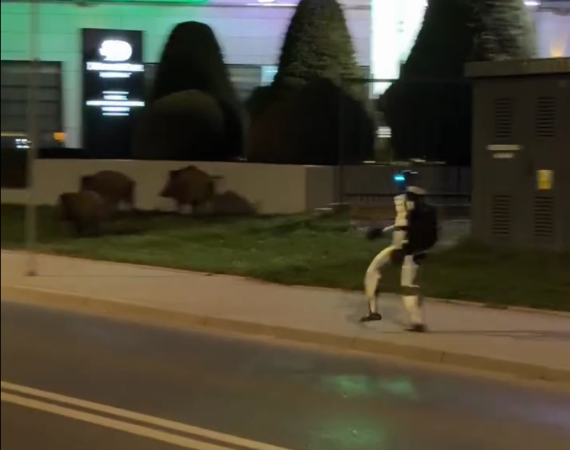 Un videoclip devenit rapid popular pe internet surprinde o scenă neobișnuită filmată pe o stradă din Varșovia: un robot umanoid se apropie de un grup de mistreți și reușește să-i pună pe fugă, într-un episod care pare desprins dintr-un film SF, dar care s-a petrecut în realitate.