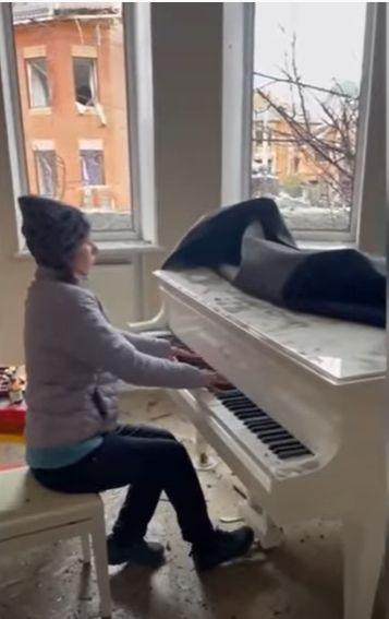 Pianista profesionistă Irina Maniukina a fost filmată îndepărtând cenușa de pe pianul ei, la doar câteva ore după ce o bombă a aterizat la 30 de metri de casa ei din Bila Tserkva, la sud de Kiev.