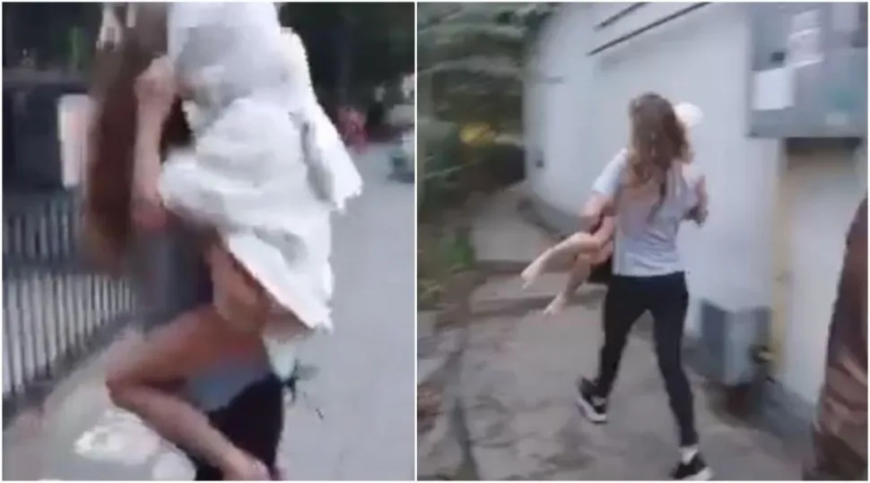 VIDEO - O tânără a vrut să își arunce fetița în fața mașinilor: „Ea vede tot, este posedată!”. Trecătorii au reușit să o oprească la timp