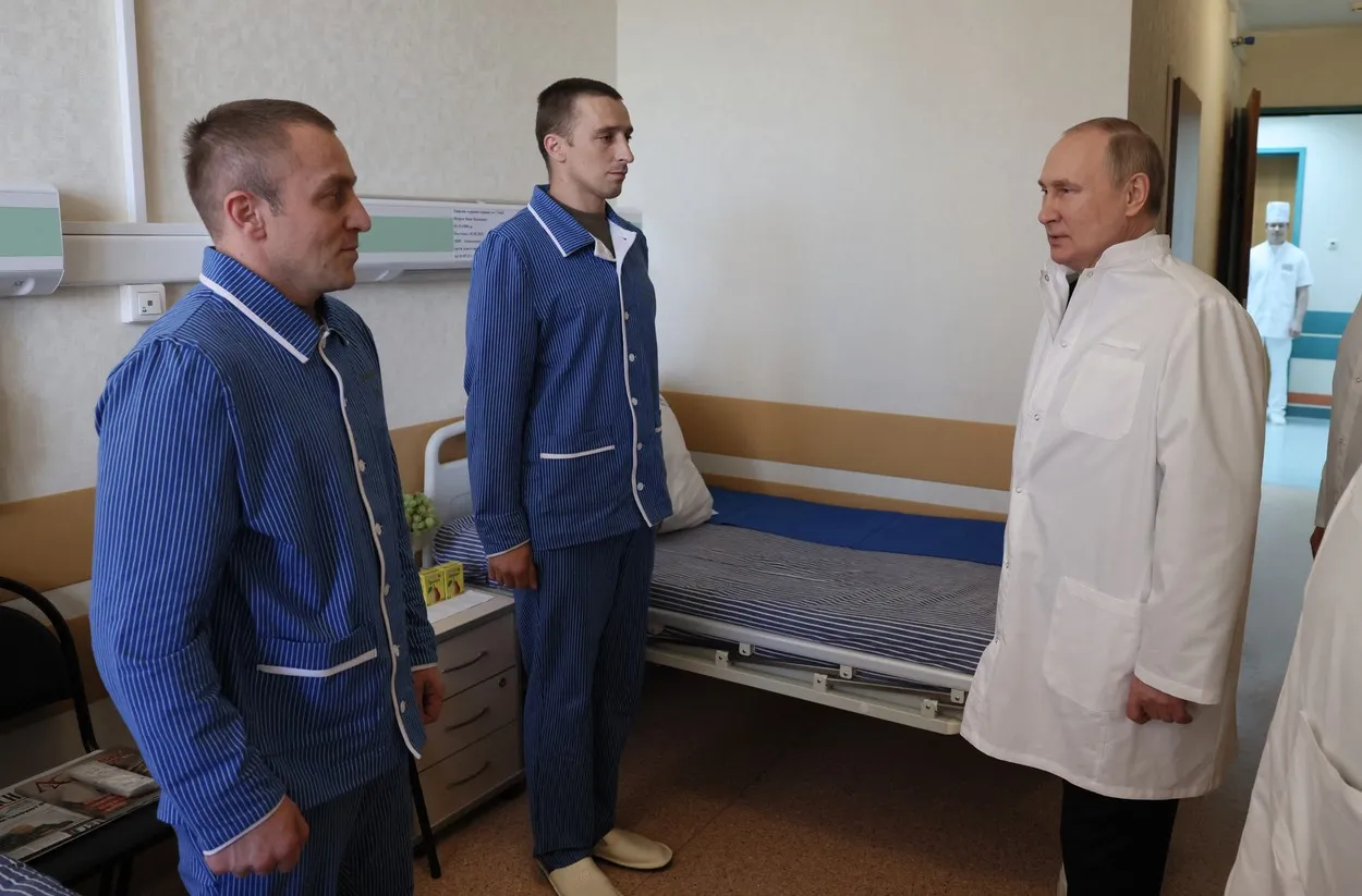 În imaginile difuzate de televiziunea rusă, Vladimir Putin apare într-un halat alb, purtând scurte dialoguri cu soldații.