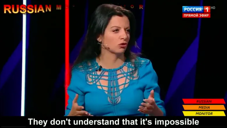 Șefa Russia Today a afirmat și că „brava lume nouă duce direct în iad”. „Peste 10 ani veți spune: Mulțumesc foarte mult. Mulțumesc că copilul meu nu a studiat niciodată în Occident, fiindcă copilul tău va rămâne o persoană normală”, a continuat apropiata regimului de la Moscova. „Indiferent ce se întâmplă și cum ne comportăm noi, confruntarea cu ei [Occidentul] va fi pentru tot restul vieților noastre”, a concluzionat șefa Russia Today.