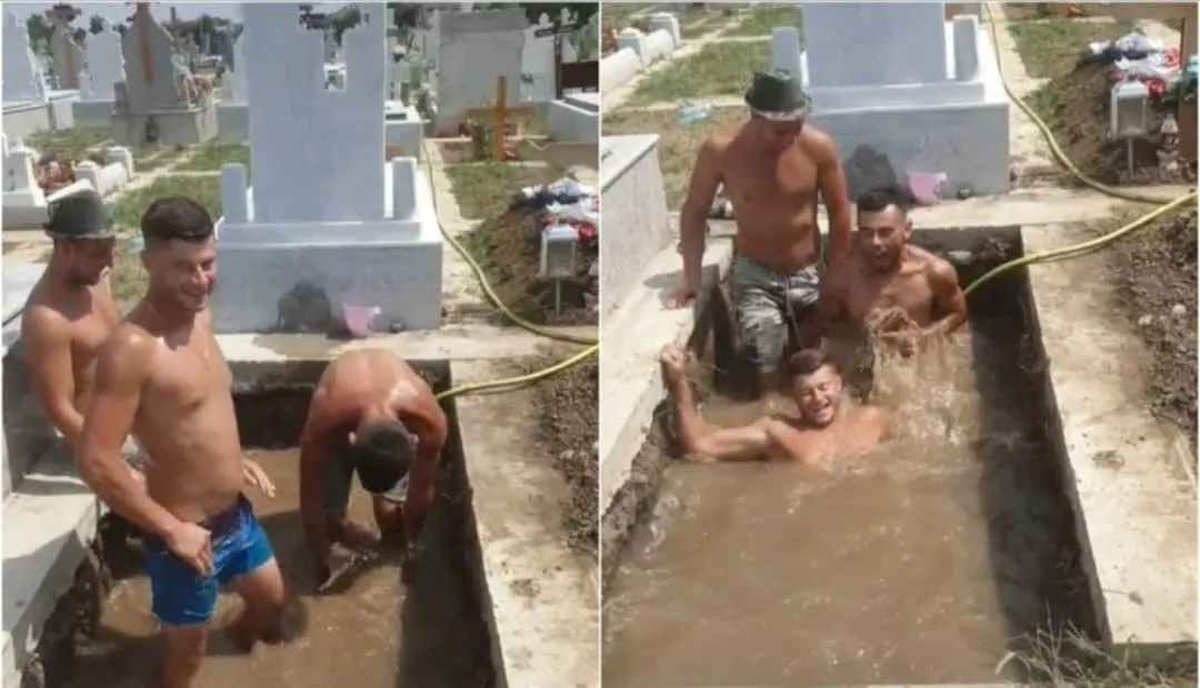 Bărbaţii au umplut groapa cu apă şi s-au scufundat în ea, cei 3 și-au filmat isprava şi au postat-o pe Tik Tok. În imagini se poate observa cum bărbații nu au nicio problemă cu faptul că se răcoresc într-un cimitir printre morminte. Ba chiar par să se distreze în contextul macabru creat.
