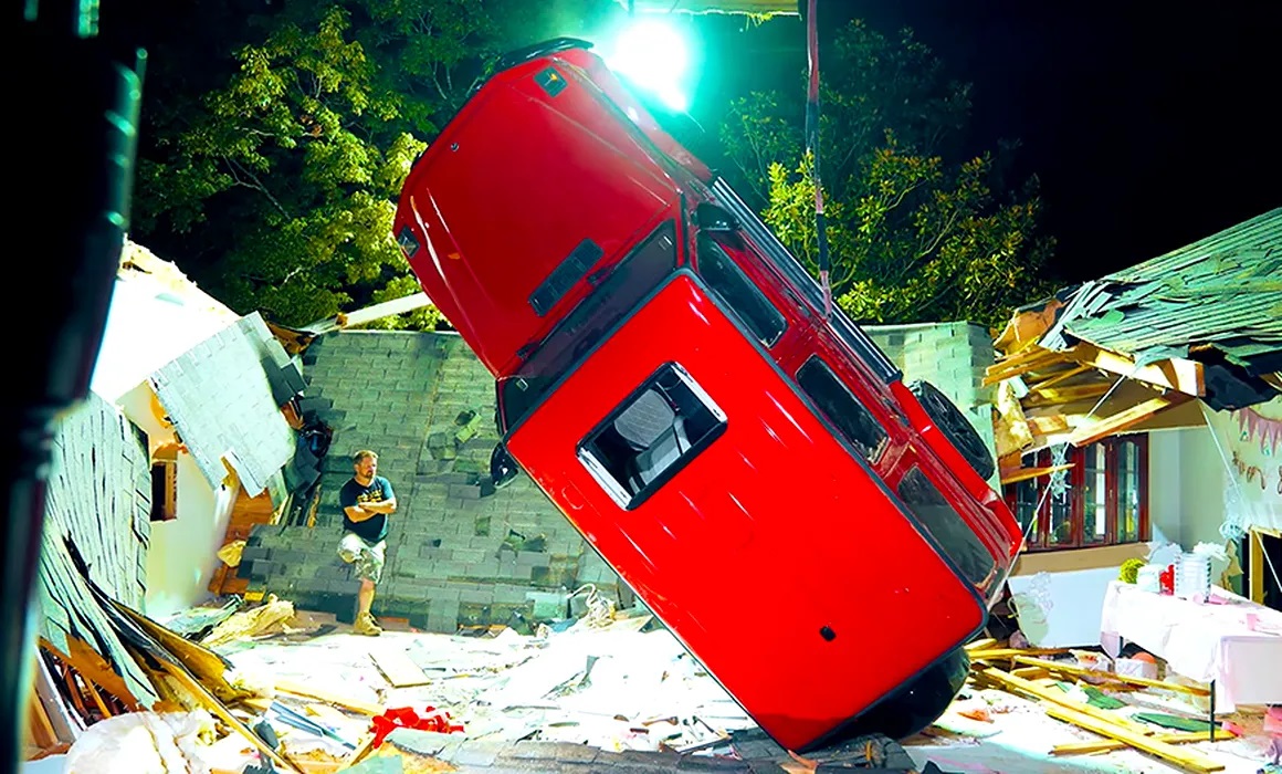 Ulterior, youtuber-ul a urcat mașina pe acoperișul unei case pregătite de demolare, iar Mercedesul s-a prăbușit prin acoperiș în interior.