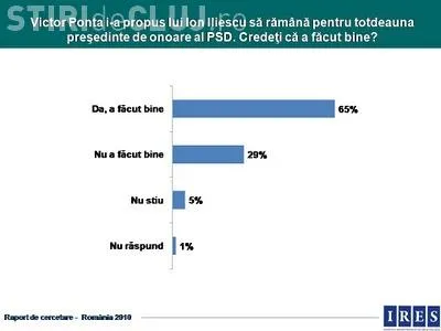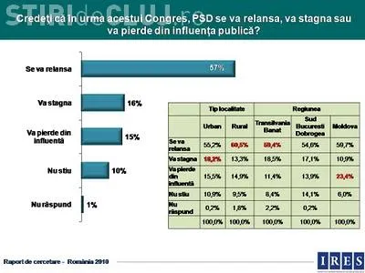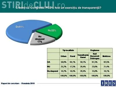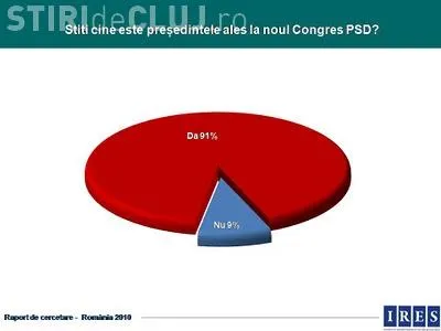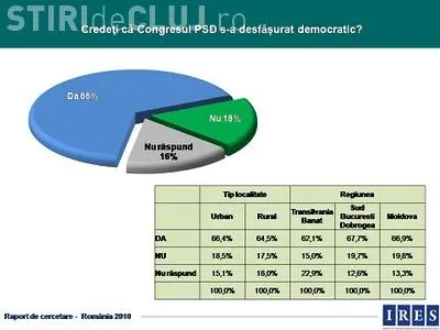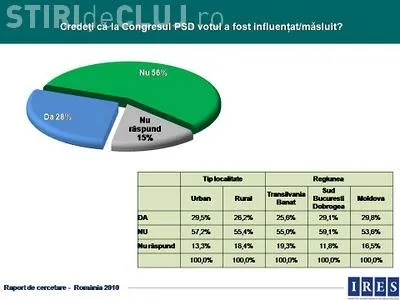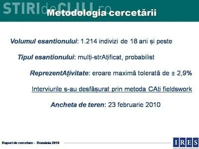 Cercetarea a fost efectuata pe un esantion de 1214 persoane si are o eroare de 2,9%. Este vorba despre o cercetare interna efectuta de IRES, "pentru a intelege efectul Congresului PSD asupra pozitionarii si brandului PSD". Cateva dintre acestea se pot vedea la rubrica FOTO.