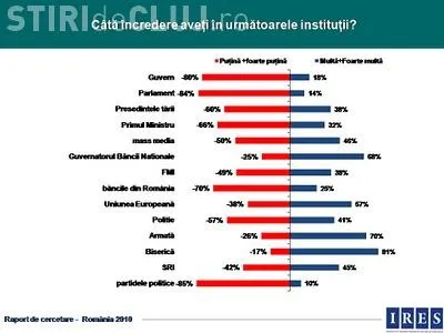 Potrivit unei cercetari efectuate de IRES, 80 % dintre romani au putina sau chiar foarte putina incredere in Guvern, iar 84 la suta in Parlament. Pe primul loc se situeaza partidele politice la neincredere: 85%. Bancile din Romania sunt pe locul 4 la capitolul neincredere: 70% dintre romani nu le confera credit.