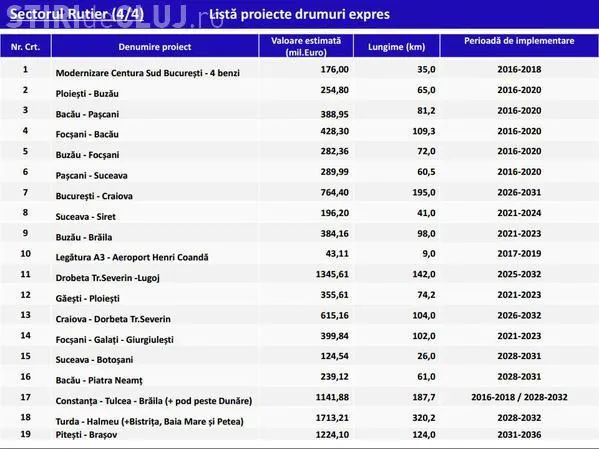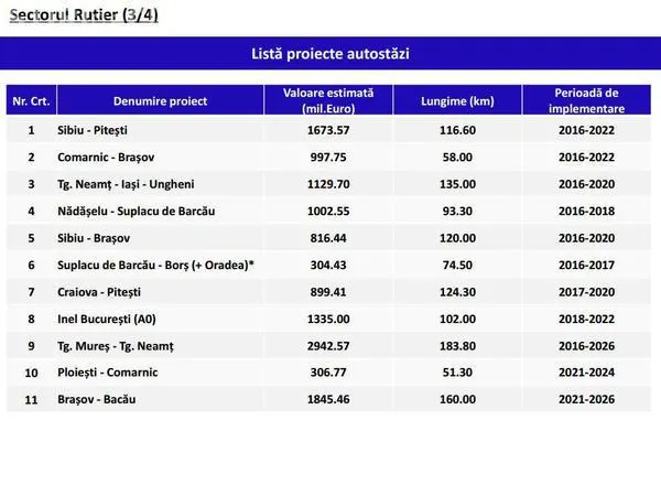 Cel mai repede, adică în 2017 şi 2018, vor trebui să fie încheiate lucrările la două tronsoane din Autostrada Transilvania, adică la porţiunea Suplacu de Barcău - Borş (+Oradea) şi la ruta Nădăşelu - Suplacu de Barcău, iar în 2020 ar trebui să fie gata şi rutele Sibiu - Braşov, Târgu Neamţ - Iaşi - Ungheni şi Craiova - Piteşti.