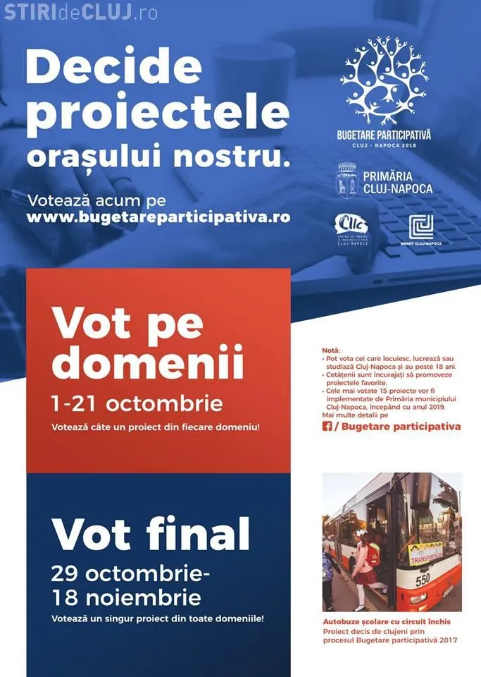 Potrivit reprezentanților municipalității, începând de astăzi, 1 octombrie 2018, toți cei care locuiesc, muncesc sau studiază în Cluj-Napoca şi au împlinit vârsta de 18 ani, pot vota proiectele depuse în cadrul procesului de bugetare participativă declarate eligibile de către Comisia tehnică de analiză din cadrul Primăriei, prin intermediul platformei www.bugetareparticipativa.ro.
