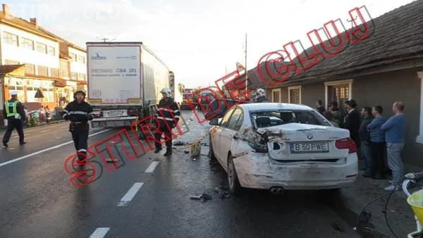 În urma impactului, autoturismul a fost proiectat într-un autovehicul staţionat pe acostamentul consolidat de pe sensul de mers spre Cluj-Napoca.