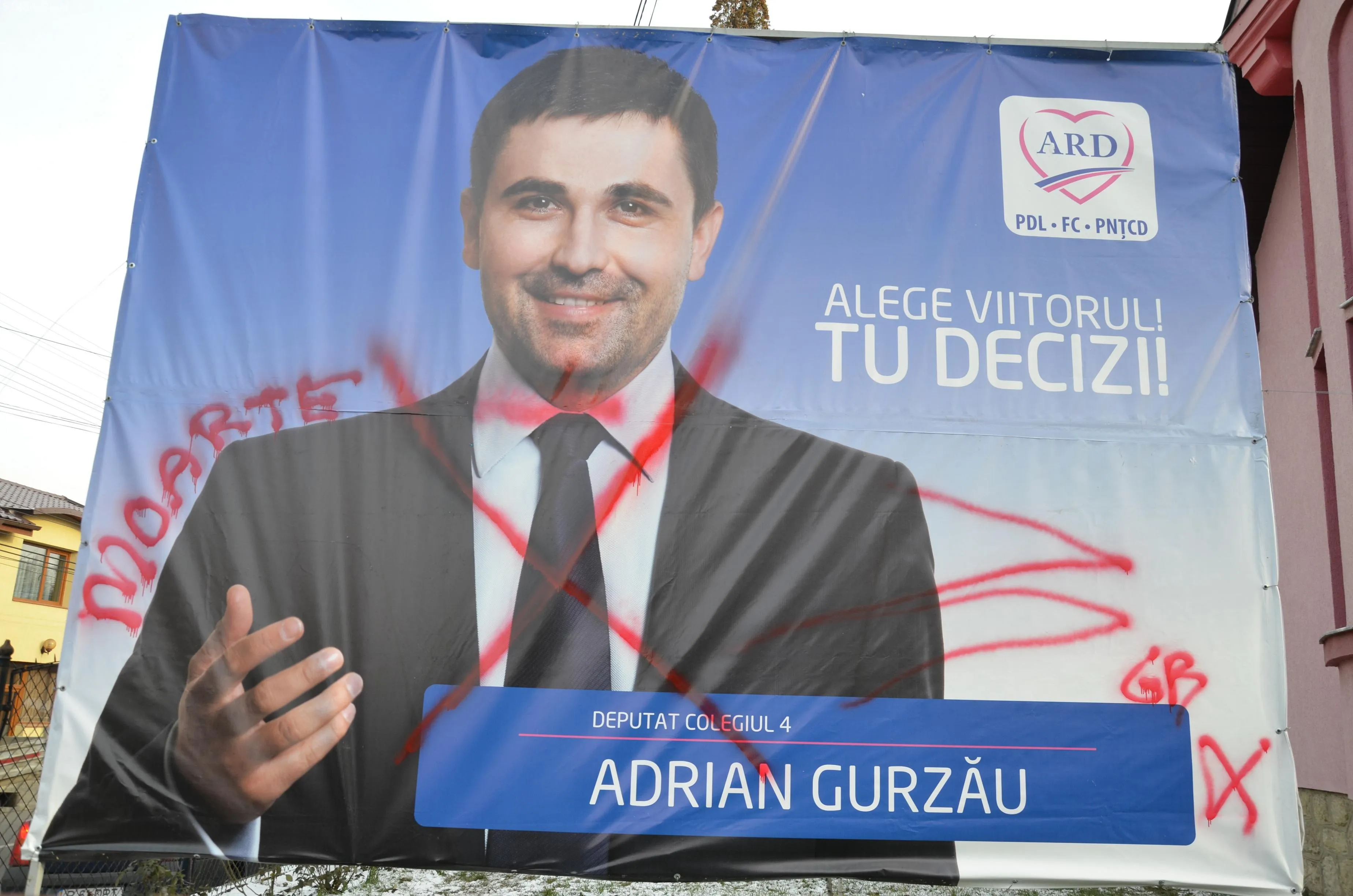 ”Panotajul a fost distrus prin graffiti, cu mesaje ofensatoare și amenințări cu moartea, ochii candidatului fiind acoperiți cu simbolul ”X”. Deputatul Adrian Gurzău dezaprobă total acest gen de campanie și cere organelor în drept identificarea și tragerea la răspundere a făptașilor”, se arată într-un comunicat al candidatului.