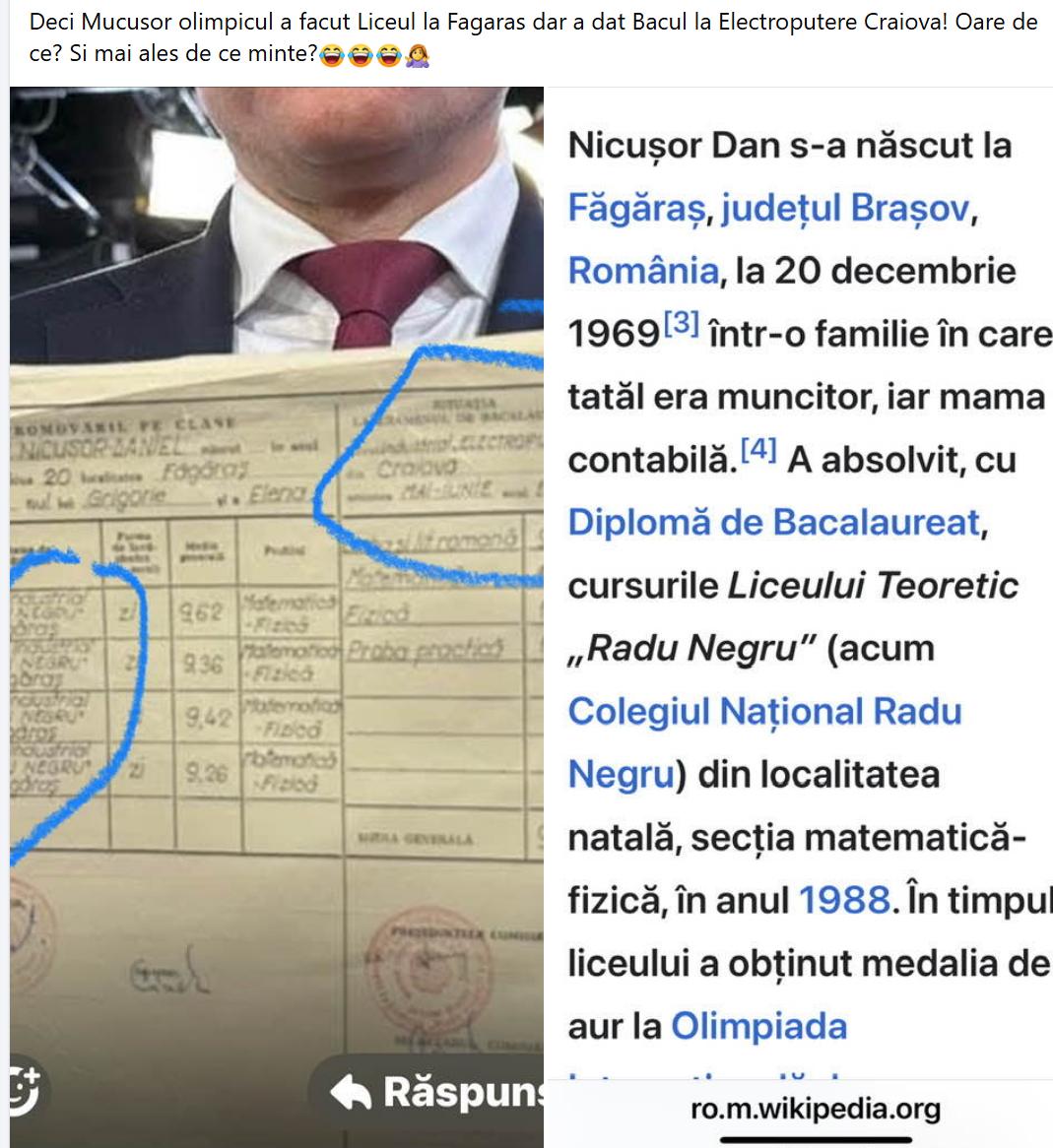 Informația pare să fi fost trecută cu vederea de realizatoarea TV Anca Alexandrescu, care a ironizat pe Facebook această situație și l-a acuzat pe Nicușor Dan că minte: „Deci Mucusor olimpicul a făcut liceul la Făgăraș, dar a dat Bacul la Electroputere Craiova! Oare de ce? Și mai ales de ce minte?” – a scris aceasta, insinuând că ar exista o contradicție suspectă.