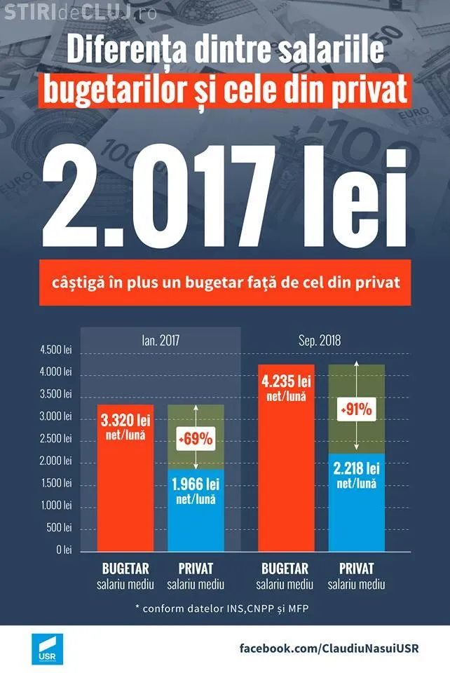 Salariul mediu în întreaga economie a fost de 2.688 lei net (stat și privat). La stat a fost de 4.235 lei net pe lună, pe când în privat a fost de aproximativ 2.218 lei. O diferență de 2.017 lei net. Salariul mediu la stat în luna septembrie a fost deci aproape dublu celui din privat (mai precis este cu 91% mai mare). De ce această diferență? Pe scurt, cu cât este cineva mai aproape de centrii de putere în stat, cu atât i-se întâmplă lucruri mai bune: salarii mai mari, pensii speciale, zile libere mai multe, vouchere de vacanță, zi scurtă vineri, cursuri de ”formare continuă” la mare și la munte, etc, atrage atenția deputatul USR, Claudiu Nasui.