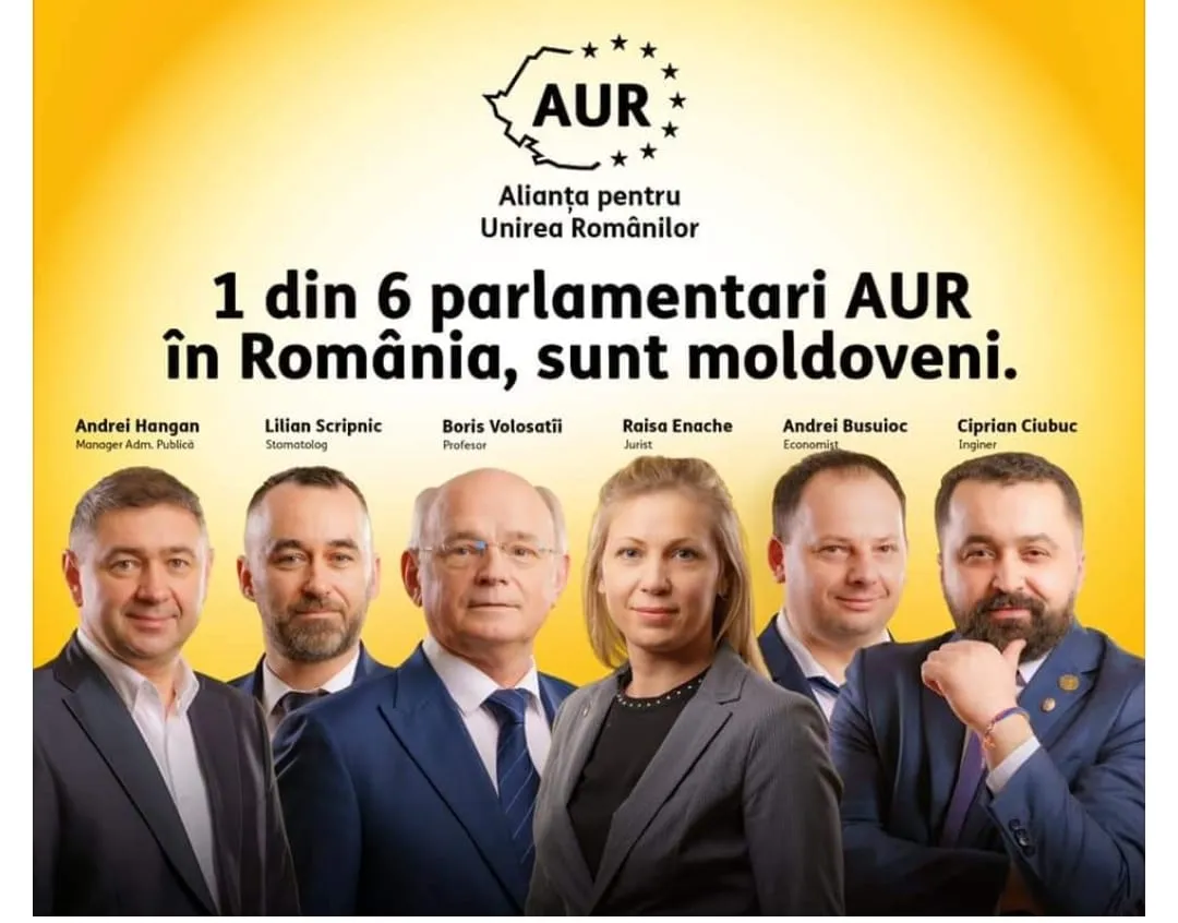 ”1 din 6 parlamentari AUR în România, sunt moldoveni.”, scriu cei de la AUR, pe bannerul pe care apar manageri, stomatologi, profesori, juriști și economiști.